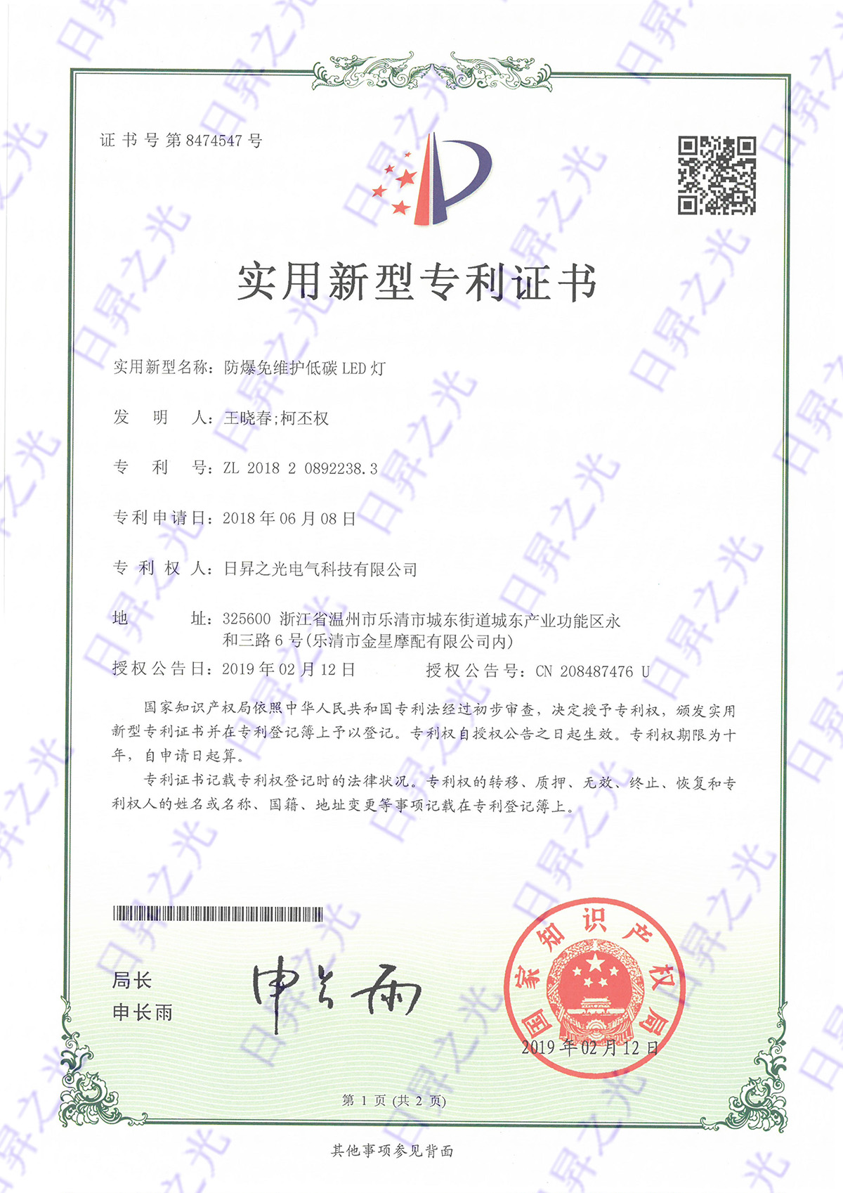日昇之光-RFBY121实用新型专利证书